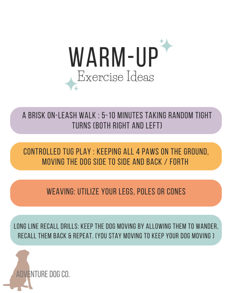 The easiest way to prevent injuries and to ensure your dog has maximum fun… get into the habit of implementing a warm up before any type of intentional physical activity.