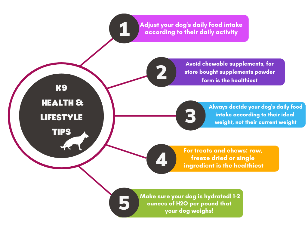 A hydrated dog is a healthy dog! Make it your daily mission to ensure that your dog stays hydrated because water is the most important ingredient in every dog’s diet! It aids in their digestion which helps with preventing weight gain, health issues and more! How much water does my dog need each day? Simple! 1-2 ounces of water per pound your dog weighs on average. Double that if your dog has a high activity day! For more information on the importance of water, check out our water blog post!